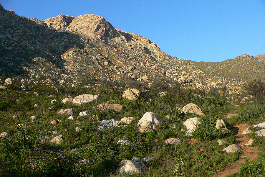 El Cajon Mountain is a multi pitch front-country sport climbing area with views all the way to the ocean. This area is located in Lakeside on the South slopes of El Cajon Mountain near the El Capitan Reservoir. El Cajon Mountain is an easily accessible climbing destination (all roads are paved), and the area offers a significant amount of climbing with a wide range of route grades. Most routes are fully bolted, though a number of them need a few pieces of gear to supplement them. Some high quality trad lines exist as well, so if you enjoy placing gear, bring a rack and you’ll likely have some of the crag’s gems all to yourself. The approach involves a 2 mile hike up 1,800 vertical feet of ever steepening. Get an early start to avoid having to do it in the hot sun.